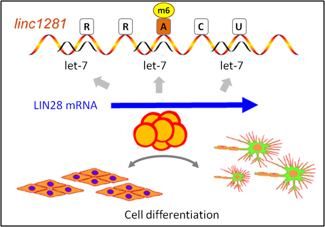 很多细胞质中的lncRNAs 可以充当竞争性内源RNAs(ceRNAs),竞争性吸附miRNA,抑制miRNA对下游靶基因的沉默[6]。 对linc1281研究发现,m6A修饰的存在对于 microRNA let-7 与其m6A位点的有效结合是必须的(图 4)。含有m6A修饰的 linc1281,顺利获得结合miRNA let-7,保护了原被let-7靶向沉默的mRNA LIN28,上调的mRNA LIN28会进一步促进细胞分化 [7]。