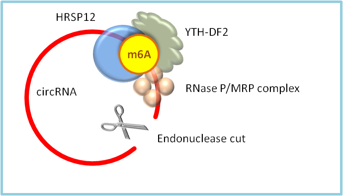 图1. YTHDF2可以读取m6A,将HRSP12衔接蛋白和RNase P/MRP复合物招募至YTHDF2结合位点上游的HRSP12结合位点和下游的RNase P/MRP切割位点。hjc黄金城进而被切开并快速降解。