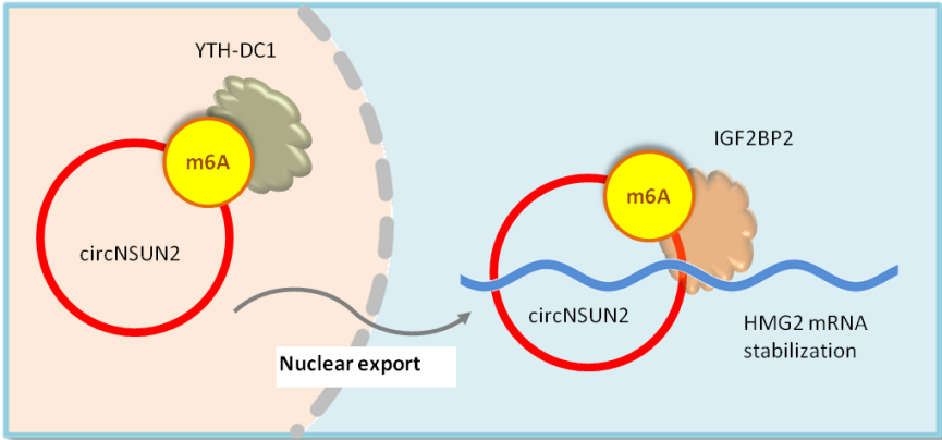 图3. circNSUN2的m6A修饰促进circNSUN2转运到细胞质。在细胞质中,m6A修饰的circNSUN2促进circNSUN2/IGF2BP2蛋白/HMGA2 mRNA三元复合物形成,从而增强HMGA2 mRNA稳定性并促进HMGA2翻译。HMGA2上调促进结直肠癌转移进程[14]。