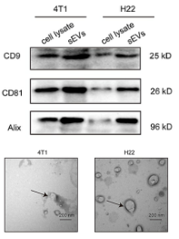 Figure 1. 小胞外囊泡的鉴定。Western blot检测小胞外囊泡的肿瘤特异性抗原CD9,CD61和Alix。电镜鉴定小胞外囊泡具有茶托状形态。