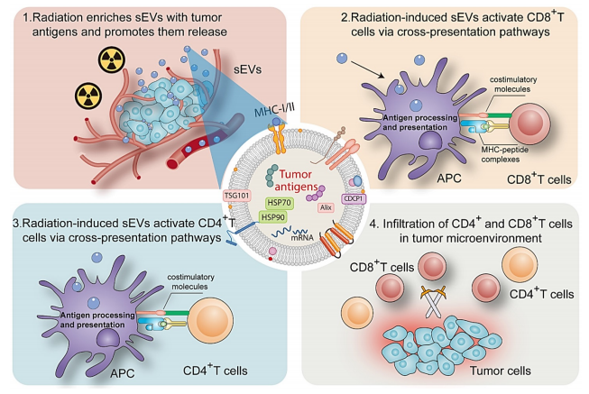 Figure 3. 辐射诱导的小胞外囊泡激活抗肿瘤免疫的机制。(1.辐射使含有肿瘤抗原的小胞外囊泡富集,并促进其从细胞内释放;2-3.这些辐射诱导产生的小胞外囊泡顺利获得交叉呈递方式激活CD8+ 和CD4+ T细胞;4.CD8+ 和CD4+ T细胞浸润至肿瘤微环境发挥免疫作用)。