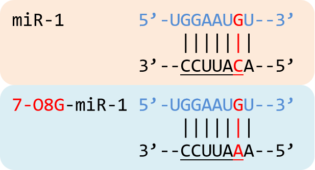 肾上腺素受体在受到激活后会产生ROS(活性氧)并导致miR-1 种子区(位置2-8)的O8G修饰,该修饰改变了原本G与C的配对,变为与腺嘌呤(A)配对,导致了miR-1靶向的mRNA发生变化,最终诱导产生心肌肥大。该研究揭示了miRNA上特定位点的o8G修饰作为表观转录修饰扮演着重要的基因调控作用。 |