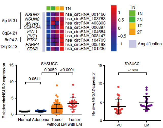 图1:上:结直肠癌和癌旁中有拷贝数变异基因位置差异表达hjc黄金城聚类图。下:qPCR验证circNSUN2在不同癌症开展阶段显著上调。