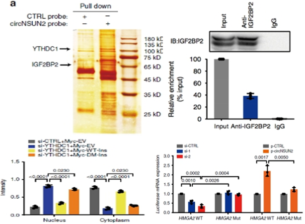 图3:上左circNSUN2的RNA pull down的银染图;上右,IGF2BP2的RIP-circNSUN2-qPCR;下左,敲低YTHDC1的胞质/胞核qPCR检测circNSUN2的定位;下右:过表达/敲低circNSUN2,IGF2BP2-RIP-qPCR发现circNSUN2与HMGA2的相互作用结合。