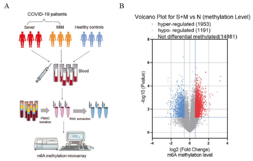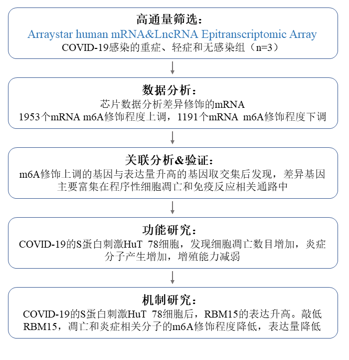 本研究使用Arraystar human mRNA&LncRNA Epitranscriptomic 芯片研究COVID-19感染后重症和轻症病人外周血PBMC细胞中,m6A修饰以及表达量具有差异的基因及功能。发现COVID-19感染后,RBM15表达明显升高,引起凋亡和炎症相关基因的m6A修饰水平升高,导致相关基因的表达量升高,从而介导了T淋巴细胞的凋亡,并释放炎症因子,引起严重的免疫反应。该结果不仅仅探讨了m6A修饰与COVID-19感染的相关性,也为后续靶向治疗COVID-19感染的药物研发给予了新的思路。