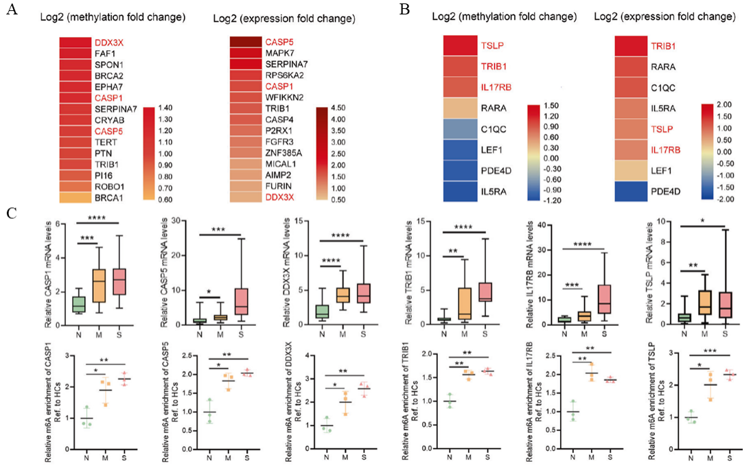 浙江大学医学院第一附属医院刁宏燕教授长期从事感染性疾病的机制研究,课题组采用Arraystar human mRNA&LncRNA Epitranscriptomic 芯片筛选发现RBM15顺利获得调控重症和轻症COVID-19感染患者的m6A修饰谱,影响感染患者的免疫反应程度。联合分析发现,m6A修饰与表达量同时上调的基因,显著富集于程序性细胞死亡和免疫反应相关的生物学过程中。功能研究发现,COVID-19蛋白刺激T淋巴细胞后,HuT 78细胞的凋亡能力和炎症因子释放能力增加,增殖能力减弱。机制研究发现,RBM15在COVID-19感染后表达量上调,敲低RBM15可显著降低淋巴细胞凋亡,抑制程序性细胞死亡和免疫反应相关基因的表达。该研究成果“RBM15-mediated N6-methyladenosine modification affects COVID-19 severity by regulating the expression of multitarget genes”于2021年发表在学术期刊Cell Death and Disease上,IF:8.469。