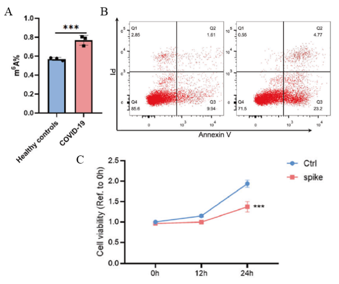 功能分析发现,使用COVID-19的S蛋白刺激HuT 78(人T淋巴细胞系),细胞的m6A修饰整体水平升高,细胞凋亡数目增加,凋亡和炎症相关基因表达升高,细胞增殖能力下降,说明m6A甲基化修饰在COVID-19感染过程中起到关键的调控作用。