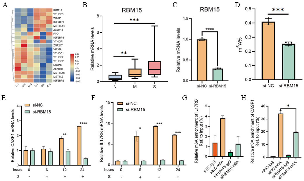 H:敲低RBM15后,S蛋白刺激HuT 78细胞,炎症相关基因IL17RB的m6A修饰水平降低。