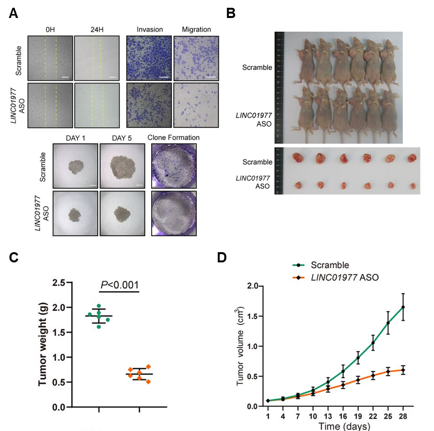 B-D In vivo实验证明敲低LINC01977抑制移植肿瘤开展(C, 肿瘤重量;D, 肿瘤体积)。