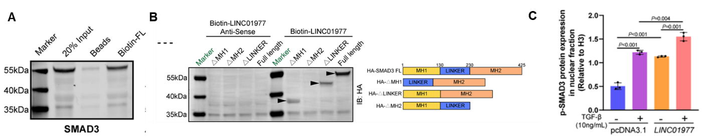 A RNA pulldown-WB证实LINC01977可结合SMAD3;