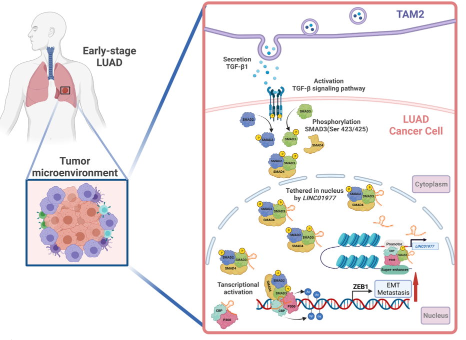 肿瘤微环境中TAM2巨噬细胞激活LUAD肿瘤细胞TGF-β/smad3通路,促进LINC01977上调,LINC01977结合SMAD3并介导其核内积累,参与和促进SMAD3/CBP/P300复合物结合ZEB1并上调其表达,促进肿瘤EMT过程。