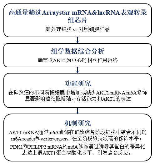 本研究使用Arraystar mRNA&lncRNA表观转录组芯片探索在砷致皮肤癌细胞模型中的RNA m6A修饰差异情况,发现AKT1 mRNA的m6A水平在砷致癌作用的不同阶段发生的动态变化,m6A修饰在调节核心靶基因AKT1方面在时间上呈现高度程序化的调节模式,可作为砷致癌作用中RNA表观遗传机制的时间标尺,对砷致皮肤癌的早期诊断具有良好的病理价值。文章不仅仅讨论了AKT1 mRNA的m6A修饰对砷致皮肤癌不同开展时期的影响,也深入探讨了m6A修饰顺利获得在不同时期结合不同的m6A reader和相应的writer或eraser,保证自身的持续高水平表达,有助于了表观遗传学修饰在癌症开展中的“双刃剑”功能的理解。且AKT1 mRNA的m6A修饰情况能作为良好的体内治疗靶点,为砷致皮肤癌的治疗给予了新的思路。