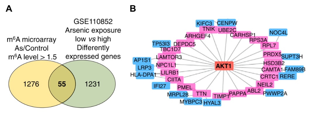 文章着重于研究m6A修饰对砷致皮肤癌在恶性增殖的不同阶段AKT1表达和活性的动态调控机制,作者运用Arraystar mRNA&lncRNA表观转录组芯片技术检测了砷处理的细胞和对照细胞的RNA m6A修饰模式,采用差异倍数≥1.5,且P值<0.05筛选出1330个在砷处理的细胞中较对照细胞具有更高m6A水平的mRNA分子。顺利获得与GSE110852数据集的RNA表达分析取交集,作者在其中筛选出55个基因在暴露于高低水平砷的受试者之间存在显著表达差异,而这些基因共同形成了一个以AKT1为中心的相互作用网络,表明关键信号节点AKT1可能是调节砷致癌发生和增殖相关过程的主要因子。在砷致癌细胞模型中,随着m6A水平的升高,AKT1表现出显著的表达上调,表明AKT1表达和功能与m6A修饰情况密切相关,具有潜在的临床价值。