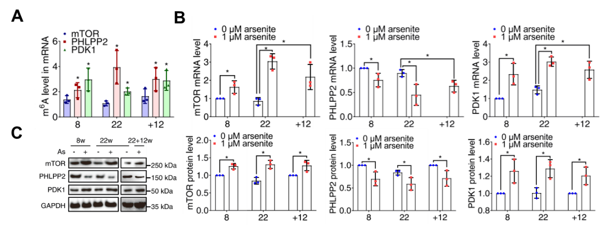 A 砷处理影响mTOR、PHLPP2和PDK1 mRNA m6A修饰水平;
