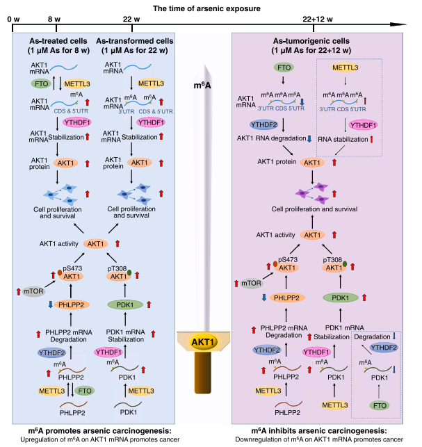 在砷致癌早期, AKT1 mRNA的m6A修饰由METTL3介导增加,并顺利获得结合YTHDF1稳定自身的高水平表达,而在晚期癌细胞中,AKT1 mRNA上的m6A 又被FTO催化降解,以免被YTHDF2结合介导mRNA降解,从而维持自身的表达,而其他的调控因子PDK1和PHLPP2 mRNA上的m6A修饰也拥有相似的动态变化模式,最终被抑制的PHLPP2和被激活的PDK1共同磷酸化高表达的AKT1,从而引发了癌变进程。