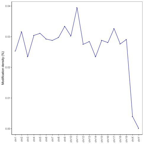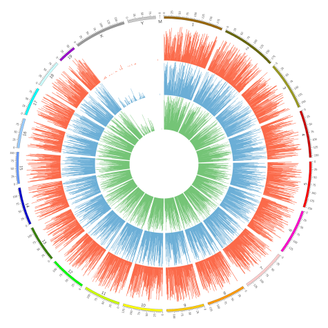 修饰密度(peaks/C)用来展示修饰区域在整个染色体上的分布情况;将修饰水平分为低(0%~30%,绿色),中(30%~70%,蓝色),高(70%~100%,红色)三类,在Circos图中进行展示(bin=1Mbp)。
