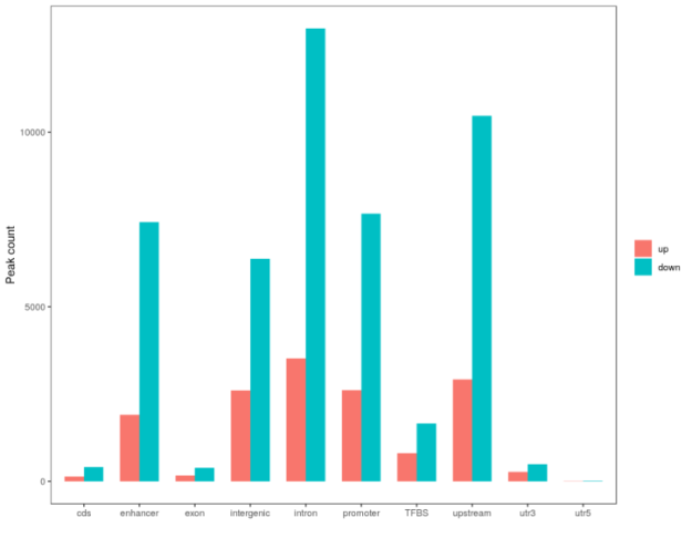 根据差异peak注释到的不同区域,对区域数量进行统计绘制条形图,并以10kb为单位对peak在染色体上的分布进行统计并绘图。