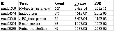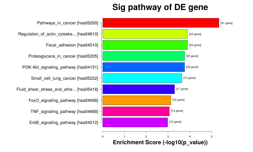 根据KEGG database (Kyoto Encyclopedia of Genes and Genomes)中的生物学通路分类条目,来找出一组差异表达基因和哪些具体的功能条目联系最大。每个Pathway条目都对应一个统计值P-value来表示显著性,P-value越小表示该GO条目和输入的差异表达基因联系越大,即该组差异表达基因P-value越小表示该Pathway条目和输入的差异表达基因联系越大。