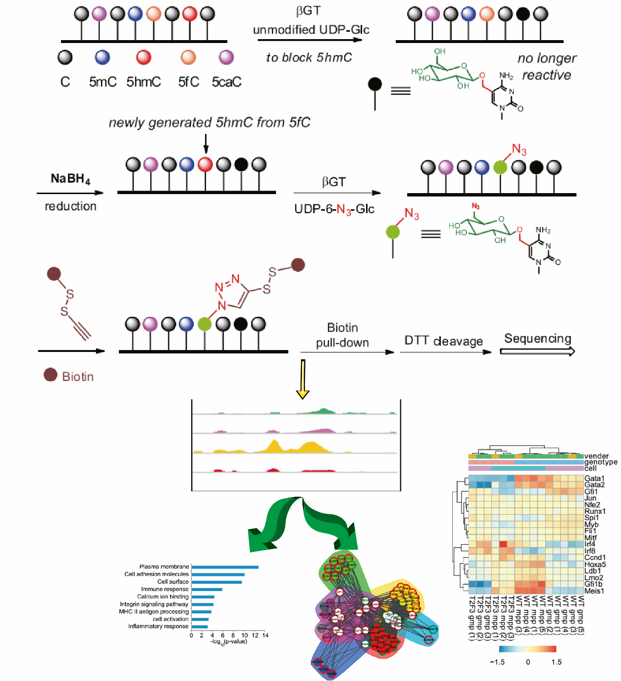用普通的葡萄糖在bGT催化作用下将内源的5hmC葡糖基化,然后在NaBH4作用下将5fC还原成5hmC。使用5hmC选择性的化学标记方法(hMe-seal)特异性富集从5fc还原产生的5hmC,进行测序。