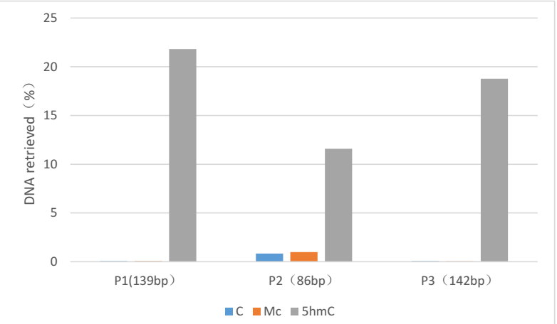 Figure 1. 分别对加入了含有3种不同修饰的spike in(分别为C、5mC和5 hmC)的DNA样品(10 ug)进行富集试验,富集完成后,分别针对spike-in的P1,p2,p3 不同位置进行PCR检测,结果显示该方法具有良好的5hmC富集特异性。
