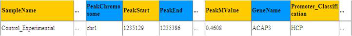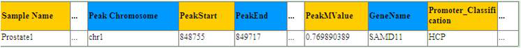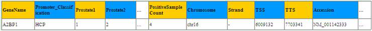 Aksomics分别给予了不同类型的启动子区域(HCP,ICP,LCP)的甲基化分析结果。下面以HCP为例,展示了甲基化峰注释表格。