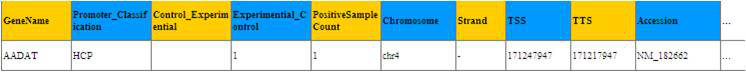 以上表第一行为例:显示的是Expriment vs Control比较中有一个DEP在基因AADAT的启动子上,这个基因的启动子属于HCP类型启动子。