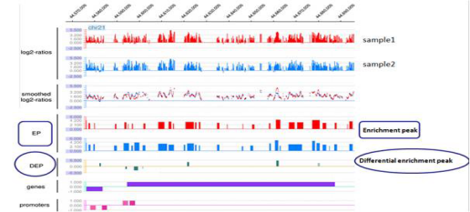 Differential Enrichment Peaks(DEP)利用重复组中多样本log2ratio的平均值分析组间差异甲基化区域,从而使得用重复样本实验数据进行甲基化结果的比较及差异甲基化区域的鉴定成为可能,这对于后续实验及分析是非常重要的。