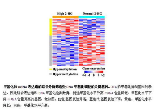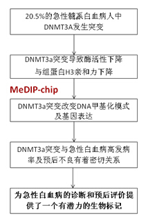 上海瑞金医院的陈赛娟院士课题组率先发现急性单核细胞白血病人中DNMT3A是高频的突变基因。功能实验结果表明DNMT3A突变之后催化活性下降。DNMT3A为重要的DNA甲基转移酶,因此使用MeDIP-chip技术检测DNMT3A突变(n=6)和野生型(n=5)两类AML-M5患者的全基因组甲基化图谱,筛选甲基化水平发生变化的具体基因。生物信息学分析发现,甲基化水平变化的基因集中在癌症相关通路中。从分子水平上说明了DNMT3A突变在白血病发病中的作用机制。