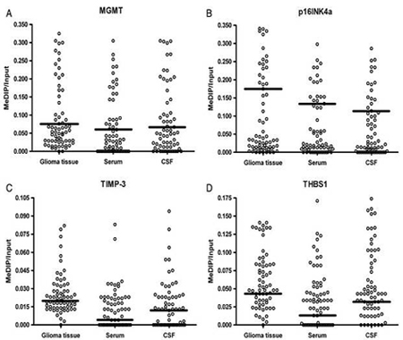 研究人员利用MeDIP-qPCR技术检测发现,在不同恶性神经胶质瘤病人的肿瘤组织,血清和脑脊髓液样本中,MGMT, p16INK4a, TIMP-3,和THBS1四个基因启动子区域都发生了高甲基化,而且血清和脑脊髓液的DNA甲基化水平与肿瘤组织基本一致(见下图)。顺利获得与临床生存数据关联分析发现,MGMT, p16INK4a和THBS1的甲基化水平可以作为独立的预测因子用于肿瘤的预后分析。因此血清或脑脊液中这些基因的甲基化有望成为新的肿瘤标志物,同时检测这些基因的甲基化水平也为恶性胶质瘤病人的化疗方案选择和预后分析给予了新的理论依据。