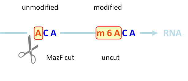 图 1. MazF可以在非甲基化ACA位点切割,而无法在甲基化m6ACA位点发挥作用