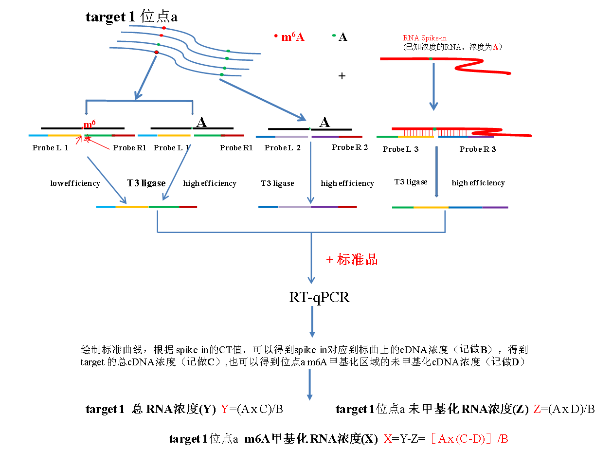 N6-甲基腺嘌呤(m6A)是RNA中丰度最高的转录后修饰,在生物学过程中扮演重要角色。很多研究发现,各类RNA上单个m6A即可发挥重要功能。由于缺乏在精确位点鉴定m6A修饰的高灵敏度方法,使得m6A的功能研究很大程度上仍未得到探索。新研究发现,T3 DNA连接酶对m6A修饰有高度的敏感性。在此基础上,hjc黄金城建立了一种高灵敏的绝对定量的实时荧光定量PCR定量分析方法,可以在单核苷酸分辨率水平上准确检测RNA中m6A修饰位点, 并对未知模板进行定量分析。该方法可成功地应用于实际生物样品中m6A修饰的精确检测,即使是低丰度RNA的样本。