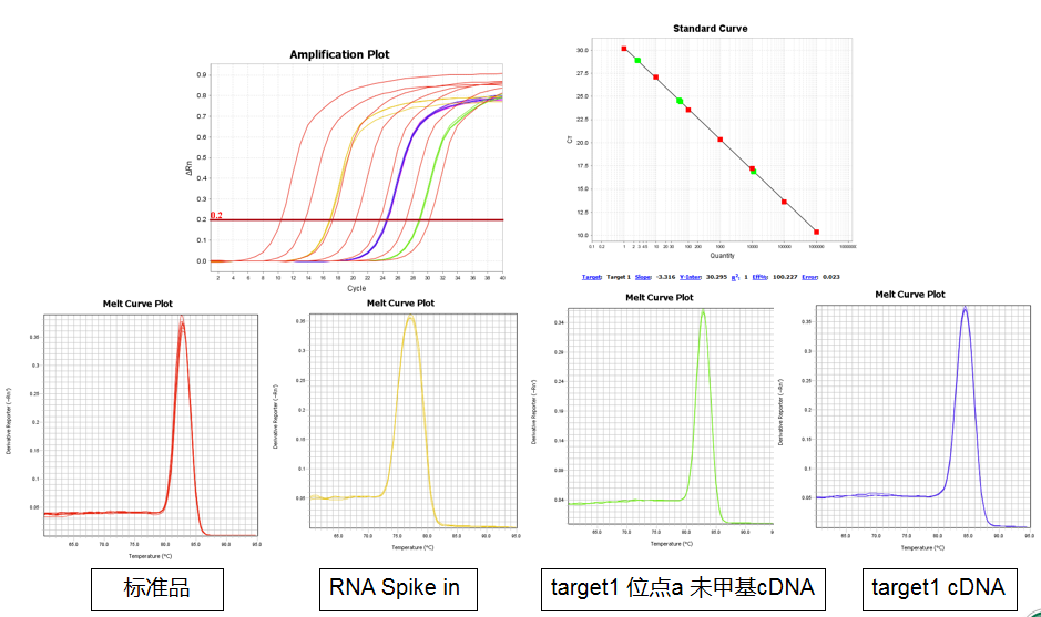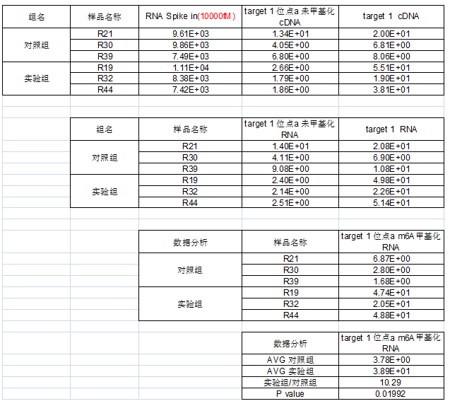 各样品的目的基因和标准品分别进行Realtime PCR反应。根据标准品绘制标准曲线,各样品目的基因总cDNA浓度、目的基因位点未m6A甲基化cDNA浓度和RNA Spike in的cDNA浓度结果直接由机器生成。【(每个样品的目的基因总cDNA浓度-目的基因位点未m6A甲基化cDNA浓度)x RNA Spike in的RNA浓度】除以RNA Spike in的cDNA浓度浓度,即为此样品此目的基因位点m6A甲基化校正后的RNA含量。
