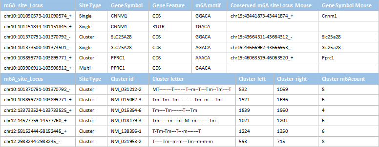 m6ACA位点来源 miCLIP dataset (Linder et al., 2015; Ke et al., 2015; Xu et al., 2017; Chen et al., 2015); RMbase database (Schwartz et al., 2013) miCLIP dataset (Linder et al., 2015; Ke et al., 2015; Xu et al., 2017; Chen et al., 2015); RMbase database (Schwartz et al., 2013) Mouse M6ACA site homologs (Linder et al., 2015; Ke et al., 2015; Xu et al., 2017; Chen et al., 2015); RMbase database (Schwartz et al., 2013)