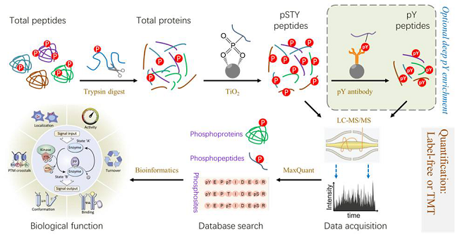 图1.定量磷酸化蛋白组技术原理和磷酸化信号调控的多种生物学过程[3]。