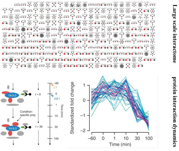 2. 为了更好的分析生物学过程的内在动态变化情况,苏黎世联邦理工学院的Ruedi Aebersold教授实验室运用AP-MS技术研究了14-3-3b scaffold protein 的蛋白互作组在IGF1刺激下,insulin-PI3K-AKT信号通路随时间的动态变化过程。[3]
