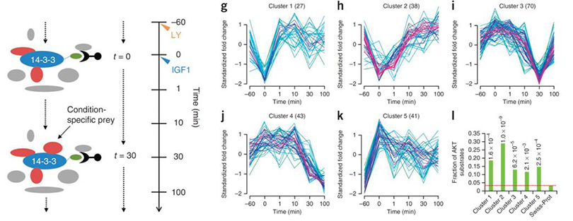图4:运用AP-MS研究14-3-3 scaffold protein 互作蛋白的时间动态关系,发现5种不同的cluster模式,对研究该信号通路的动态变化过程具有重大指导意义。