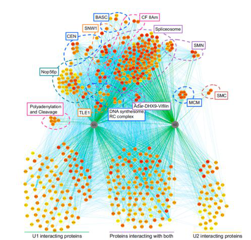 相互作用网络图进一步展示了U1/U2互作蛋白富集情况:位于上部的为已知蛋白,主要为剪接体蛋白,位于下方的为功能未知蛋白,包括只与U1或U2互作的蛋白以及和两者共同作用的蛋白。ChIRP-MS技术不仅能够很好的鉴定已知的RNA互作蛋白,同时也能鉴定未知蛋白,是研究RNA-protein相互作用的强大工具。