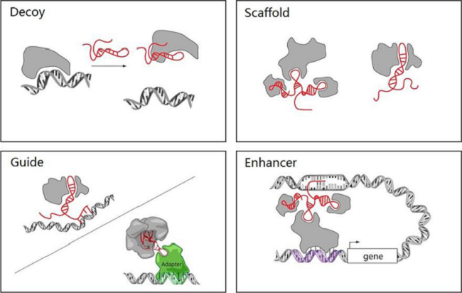 作为基因组DNA的直接产物,RNA对生命活动有着至关重要的意义,是生命活动的又一执行者:1、参与蛋白质的合成;2、参与转录后修饰和DNA修复;3、参与基因表达调控等。对于一种特定的RNA(如,lncRNA,mRNA,hjc黄金城,microRNA,tRF&tiRNAs等),往往具有与之对应的相互作用蛋白共同执行特定的生理功能,以lncRNA为例,近年来,lncRNAs在基因表达调控方面的重要功能越来越被人们所关注,但它们的具体功能还有待阐明。LncRNA可能顺利获得4种作用机制参与基因调控:Decoy,作为诱饵分子,替代蛋白与DNA的相互作用;Scaffold,作为骨架分子,为蛋白复合体给予空间支撑作用;Guide,作为引导分子,介导蛋白-蛋白、蛋白DNA/RNA相互识别;Enhancer,作为增强子类似组件,促进基因表达[1] 。运用RNA亲和纯化技术(eg. ChIRP-MS,RAP-MS[2]),构建特定RNA相互作用蛋白谱,对阐明RNA的生理病理机制至关重要。