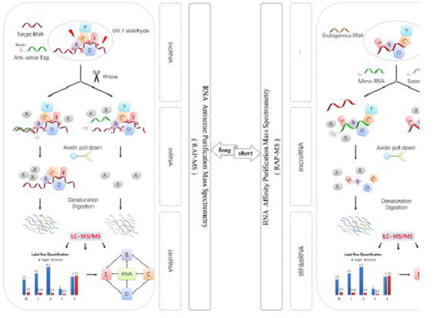 长链RNA:例如,lncRNA、hjc黄金城、mRNA等常采用RNA Antisense Purification – Mass Spectrometry策略。生物样品在非变性条件下裂解和UV交联,或者不裂解直接在原位进行UV交联,随后用biotin标记的RNA anti-sense进行杂交(Control组采用非特异anti-sense或预先用RNase处理)。