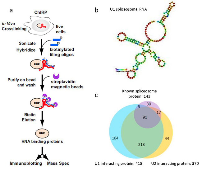 第一时间,为了对ChiRP-MS方法进行验证,作者选择了两种已知的snRNA,U1/U2(参与剪接体的组装)进行验证实验。U1/U2具有很高的表达量,同时,剪接体的组分研究得较为清楚,另外,U1/U2在抑制未成熟mRNA的剪接和poly-A化方面的作用已见报道,预示着更多未知的相互作用蛋白可能被鉴定到,因此U1/U2很适用于ChIRP-MS方法验证。针对U1/U2设计anti-sense RNA进行ChIRP-MS实验,结果如下:U1和U2分别富集了418和370个蛋白,其中113个已知的剪接体蛋白(共143个)(c)。