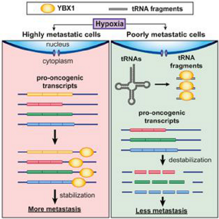 在多种应激条件下,tRNA能够发生特异性酶切,产生一类功能独特的tRNA片段(tRFs),和许多生理病理过程密切相关。来自Rockefeller University的科学家顺利获得高通量测序技术发现一类tRFs特异性高表达于高转移性乳腺癌细胞中,并具有特定的motif,据此推测,细胞中可能存在某些与之特异性识别的蛋白质。为了鉴定这些未知的相互作用蛋白,作者运用RNA亲和纯化技术,用biotin标记的tRFs片段进行pull down(短链RNA RAP-MS技术),结合LC-MS/MS鉴定和定量分析,发现一个潜在的结合蛋白YBX1,并进行了深入研究。结果表明,YBX1蛋白能够与肿瘤转移相关基因mRNA结合并稳定mRNA,而tRFs可与mRNA竞争性结合YBX1,进而使肿瘤转移相关的mRNA去稳定性,抑制肿瘤的转移性。[4]