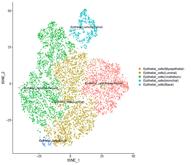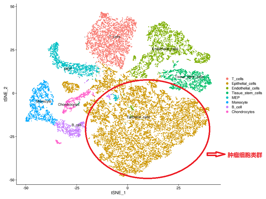 基于无监督算法,对所有细胞进行聚类分析,并顺利获得不同细胞特异性marker基因进行细胞类型鉴定,使用t-SNE降维算法进行绘图展示,图中每个点代表一个细胞,相同颜色为一个细胞类群,从而将肿瘤细胞与其它细胞分开,分别进行差异基因表达分析。