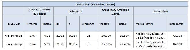 Group m7G miRNA level (normalized, log2): 基于Cy5标记的m7G-IP RNA的初始信号值得到的log2转换的标准化后的组平均值。