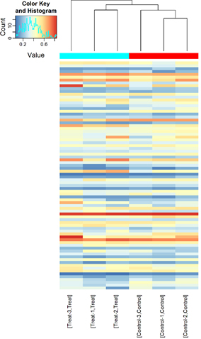 图1.差异修饰small RNA的分层聚类热图。 修饰的RNA水平由左上方小图中红蓝色色标表示。顶部树状图显示了样品之间修饰图谱相对接近度。组别由热图上方的色条表示。