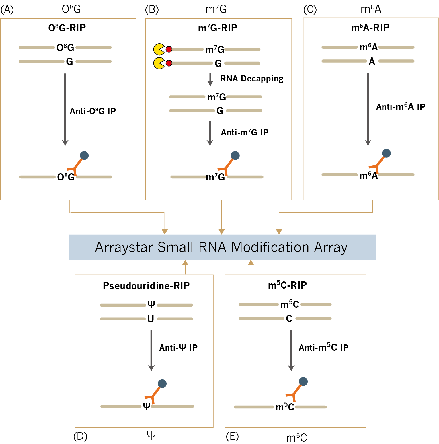 图1. Arraystar small RNA修饰芯片技术,分别鉴定和定量small RNA转录后修饰,分别为o8G,m7G,m6A,Ψ和m5C。使用特异性抗体顺利获得免疫沉淀富集修饰的small RNA后,使用Arraystar small RNA修饰芯片进行鉴定和定量。