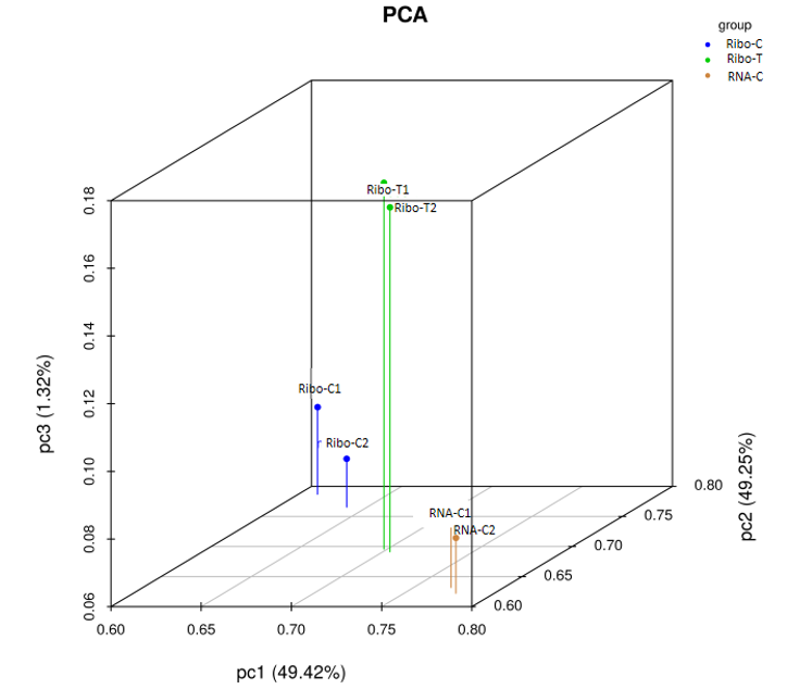 PCA 结果展示了样本间数据的分类情况,每种颜色代表各个分组,每个坐标轴代表一种主成分。
