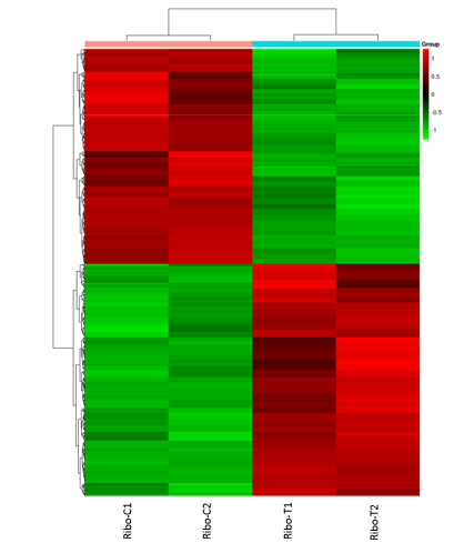 Ribo-C vs Ribo-T 显著差异TE基因聚类示例。差异表达基因聚类图。每行代表一个基因,每列代表一个样本。红色代表TE上调显著差异基因,绿色代表TE下调显著差异基因。