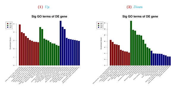 GO 分析(BP、CC、MF)结果中差异最显著的前 10 个 GO 条目 bar 图。按照 p-value 从低到高排列,纵坐标表示 p-value(-log10 转化)。