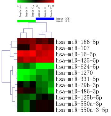 图释:不同样品组之间差异表达miRNA的聚类示例。