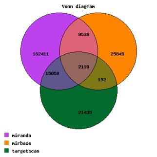 Aksomics顺利获得三大数据库(miranda, mirbase, targetscan)预测miRNA靶点信息,将三种数据库的结果交集作为最终miRNA的靶基因结果,有效的降低了靶基因预测的假阳性率。Venn图展示了对于特定miRNA列表利用上述数据库的多个预测结果的整合分析。同时构建了miRNA-靶基因的网络图,直观的展示miRNA及其靶基因的调控关系。